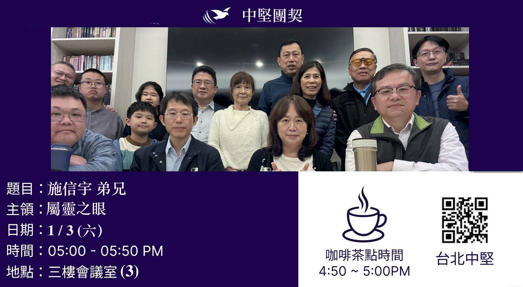 - 1/24(六)下午14:00月佈道,主題:「心中盼望的緣由」,一樓備有傳單,請弟兄姊妹踴躍拿回去邀請尚未信主的親朋好友參加。下午聚會後,也邀請時間方便的同靈一起去發福音單,請在聚會後在六樓禱告室集合,禱告後和福音同工一起出去發傳單。