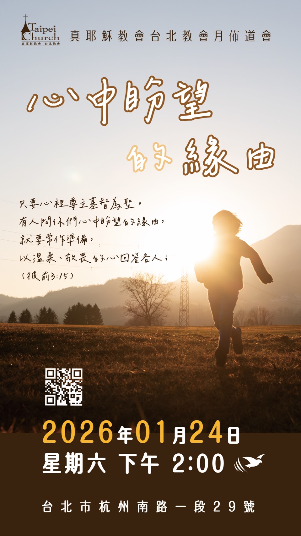 - 1/24(六)下午14:00月佈道,主題:「心中盼望的緣由」,一樓備有傳單,請弟兄姊妹踴躍拿回去邀請尚未信主的親朋好友參加。下午聚會後,也邀請時間方便的同靈一起去發福音單,請在聚會後在六樓禱告室集合,禱告後和福音同工一起出去發傳單。