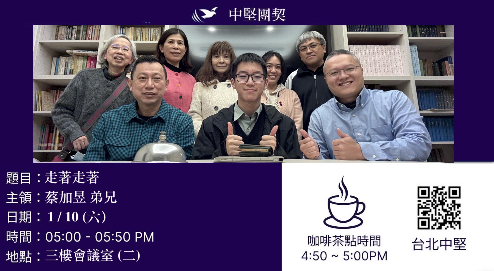 - 中堅-以利沙查經團契聚會,時間: 17:00-17:50題目:「走著走著」,主講者:蔡加昱弟兄,地點:三樓會議室(2),歡迎中堅團契成員參加。