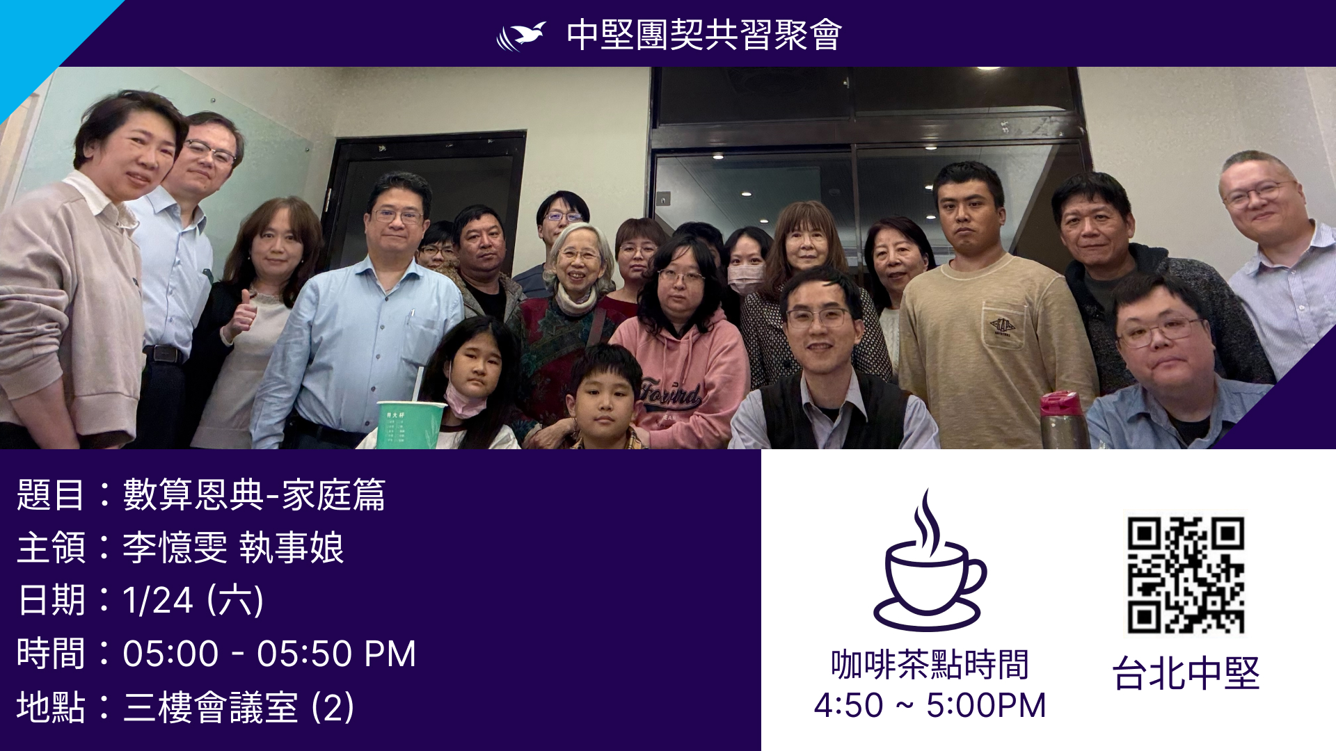 - 中堅-以利沙查經團契聚會,時間:16:00-16:50查經-哥林多前書第1章,主領:陳芳蘭姊妹。共習17:00-17:50題目:「數算恩典-家庭篇」,主講者:李憶雯姊妹,地點:三樓會議室(2),歡迎中堅團契成員參加。