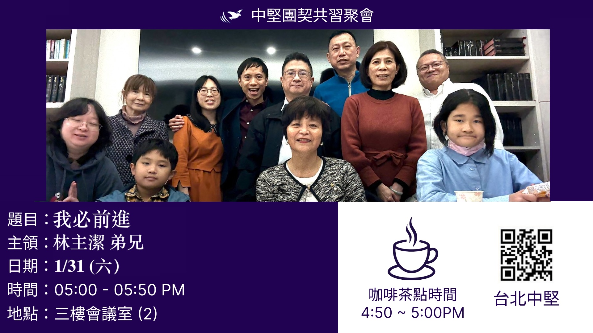 - 中堅-以利沙查經團契聚會,時間:16:00-16:50查經-哥林多前書第2章,主領:楊秉真執事。共習17:00-17:50題目:「我必前進」,主講者:林主潔弟兄,地點:三樓會議室(2),歡迎中堅團契成員參加。